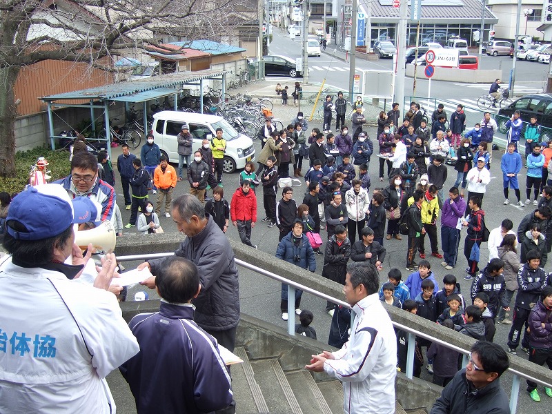 美杉台小学校校庭にて開会式が行われました。力強く、開会宣言です!今回の駅伝には、25チームの参加がありました。